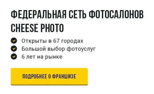Фотосалон Cheese Photo является федеральной сетью фотосалонов, у нас большой опыт в работе, быстрая скорость обработки заказов и высокое качество услуг и товаров. Мы предлагаем разнообразный набор фотоуслуг: печать фотографий; печать ваших фотографий и изображений на различной сувенирной продукции; фото на документы; реставрацию фотографий и др.